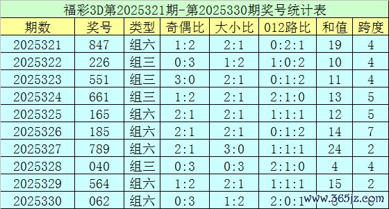 上期归来:福彩3D第2025330期开奖号码为062,组选类型为组六,奇偶比为0:3,大小比为1:2。