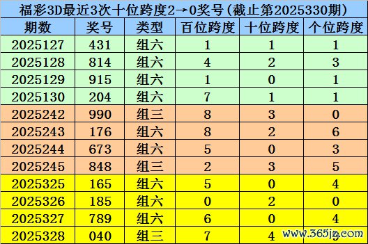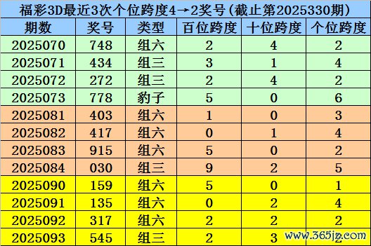 末位跨度分析:前3期末位奖号为0-4-2,最近两期末位奖号跨度为4、2,末位奖号跨度历史上绽开两期开出4、2的风光共165次,其最近两次奖号为: